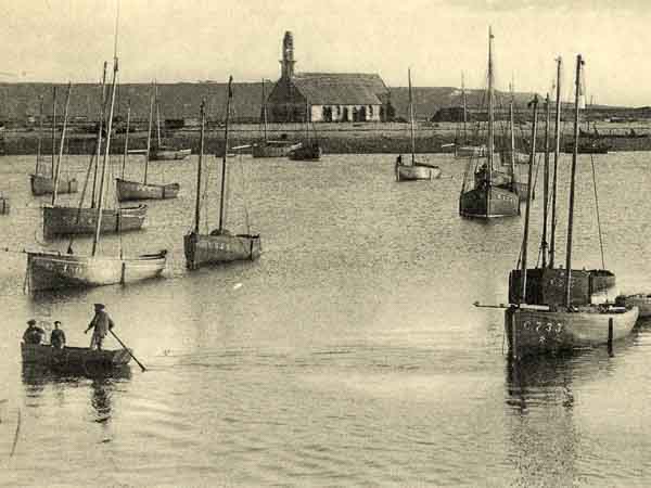 Au premier plan le "Seignelay" fait sécher ses filets à sardines. Au fond, la chapelle Rocamadour sans sa toiture suite à l'incendie du 2 février 1910 (coll Salaun - mairie de Brest)).